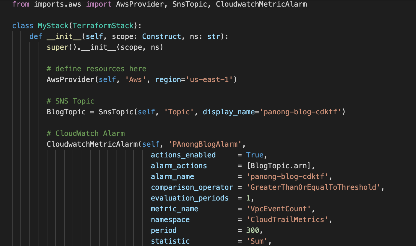 I have shared a simple AWS CDK and CDKTF example on my blog that can be used to create a CloudWatch Alarm and SNS Notification written in Python.